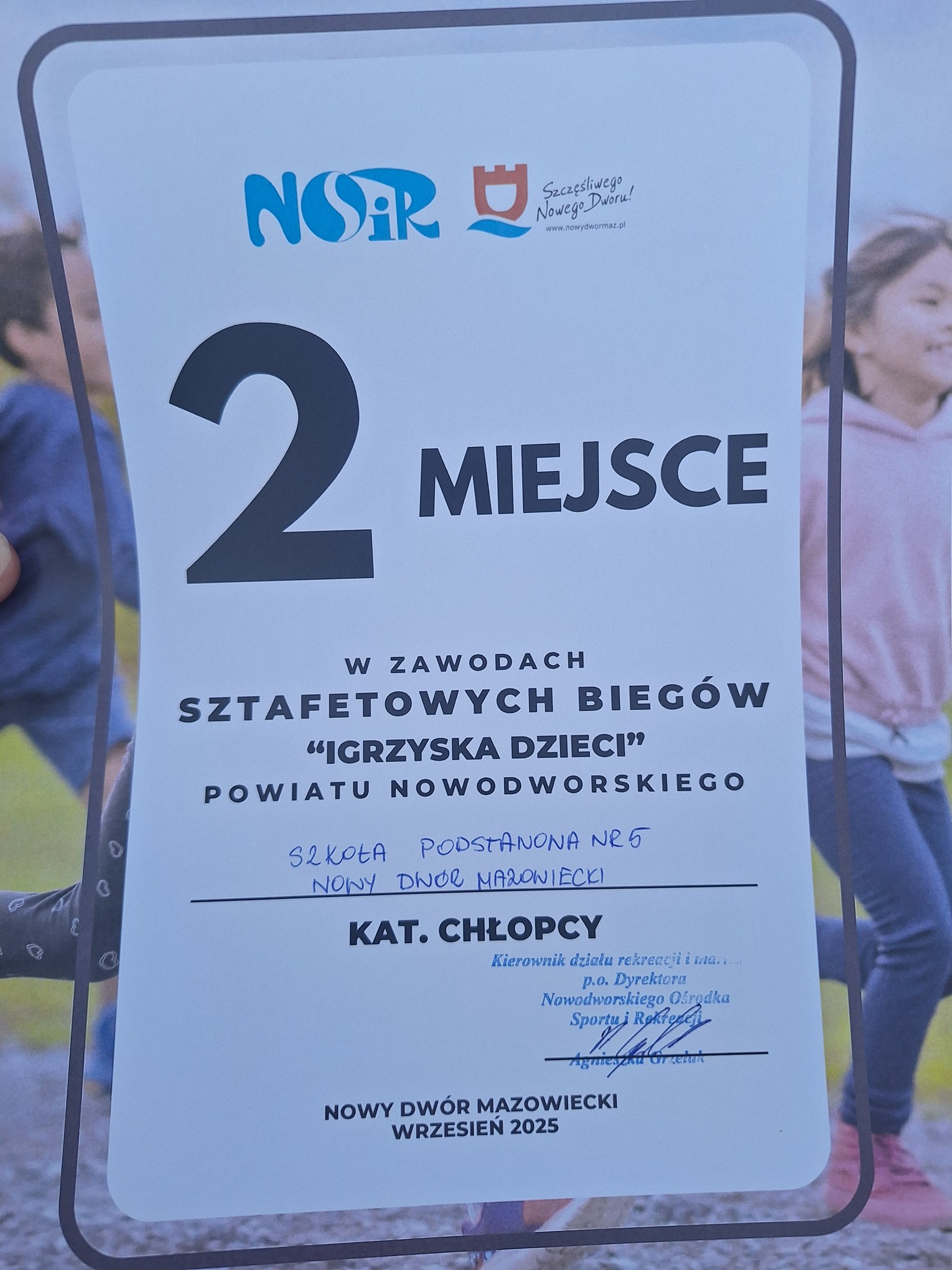 W dniu 29 września reprezentacja chłopców naszej szkoły wzięła udział w zawodach sztafetowych biegów przełajowych „Igrzyska Dzieci” powiatu nowodworskiego. Zawodnicy biegli sztafetę na dystansie 6x800 metrów. Wszyscy zaprezentowali wysoką formę i ogromną wolę walki. Przegrali niestety z jednym zespołem zajmując tym samym 2 miejsce. Gratulacje dla chłopców za włożony wysiłek i wzorową postawę sportowca.