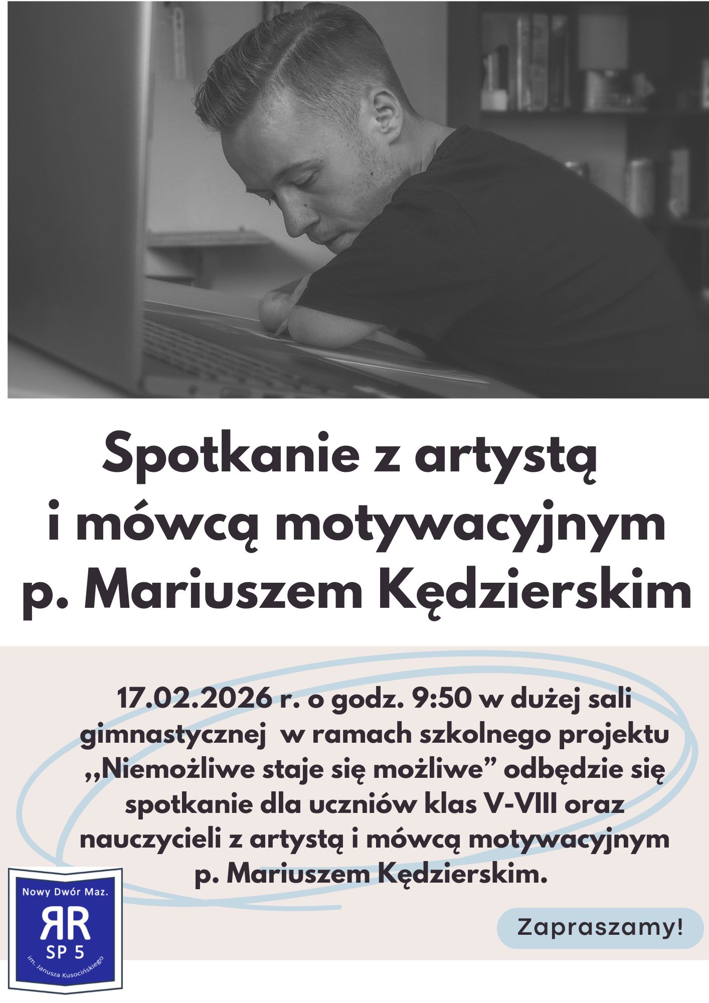 17.02.2026 r. nasza Szkoła będzie ponownie gościć p. Mariusza Kędzierskiego- artystę bez rąk, mówcę motywacyjnego oraz zdobywcę Nagrody Publiczności w konkursie 'Człowiek Bez Barier 2015'. Spotkanie dla klas V-VIII odbędzie się w ramach szkolnego projektu pt. ,,Niemożliwe staje się możliwe” przy wsparciu finansowym Rady Rodziców. Więcej szczegółów na zamieszczonym plakacie.