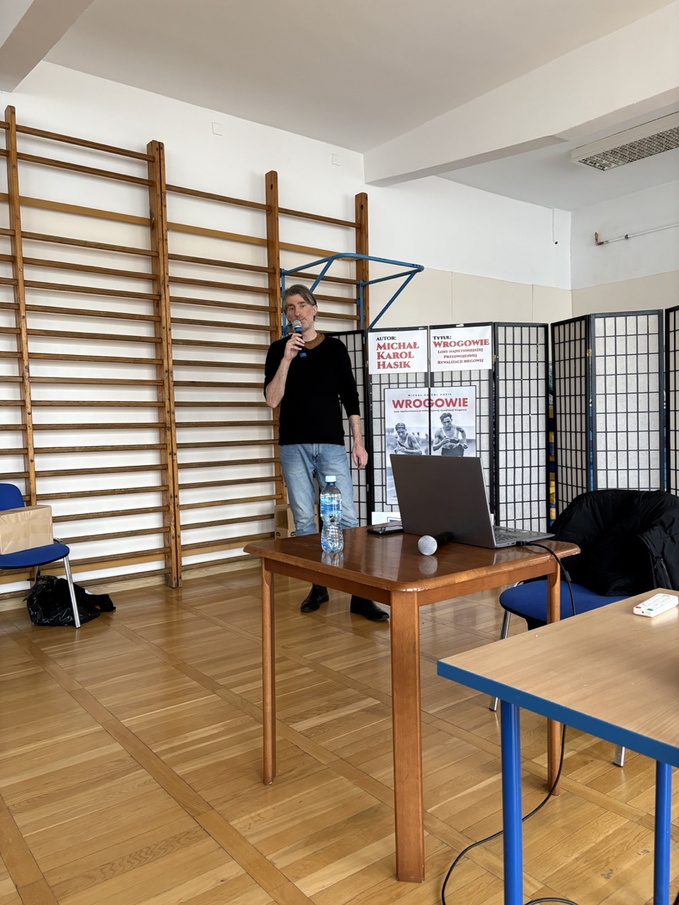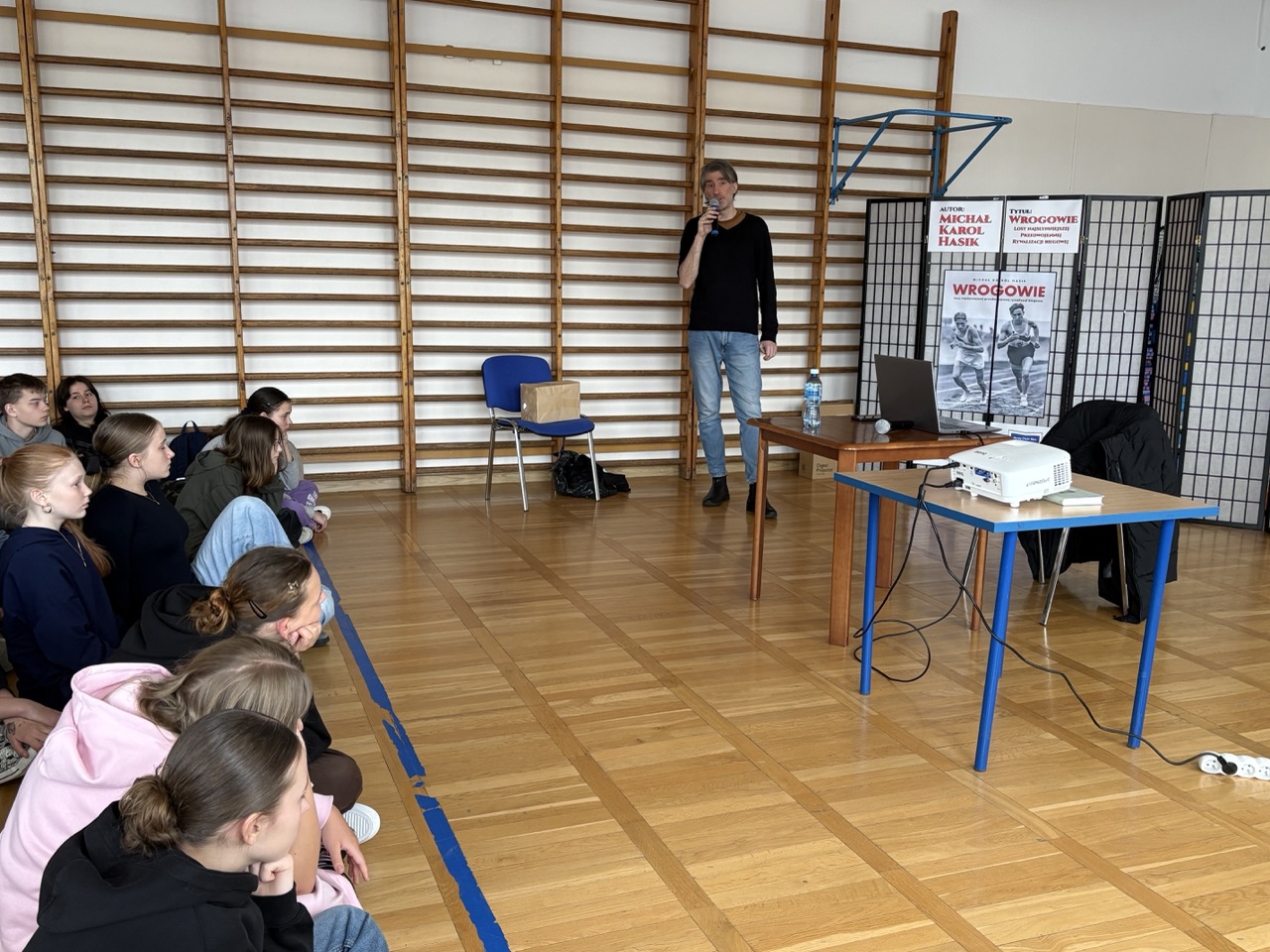 Pan Michał Hasik jest dziennikarzem Przeglądu Sportowego, organizatorem imprez biegowych oraz pasjonatem historii sportu. Jest również autorem książki pt. „Wrogowie”, poświęconej rywalizacji dwóch wybitnych polskich biegaczy okresu dwudziestolecia międzywojennego: Janusza Kusocińskiego i Stanisława Petkiewicza. Ze względu na szeroką wiedzę oraz lekki, reporterski styl wypowiedzi, poprosiliśmy autora o przeprowadzenie spotkania z naszymi uczniami.
