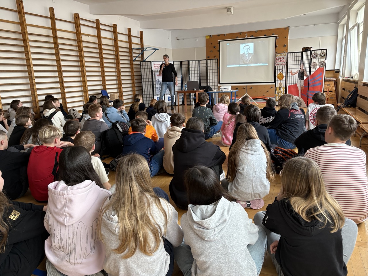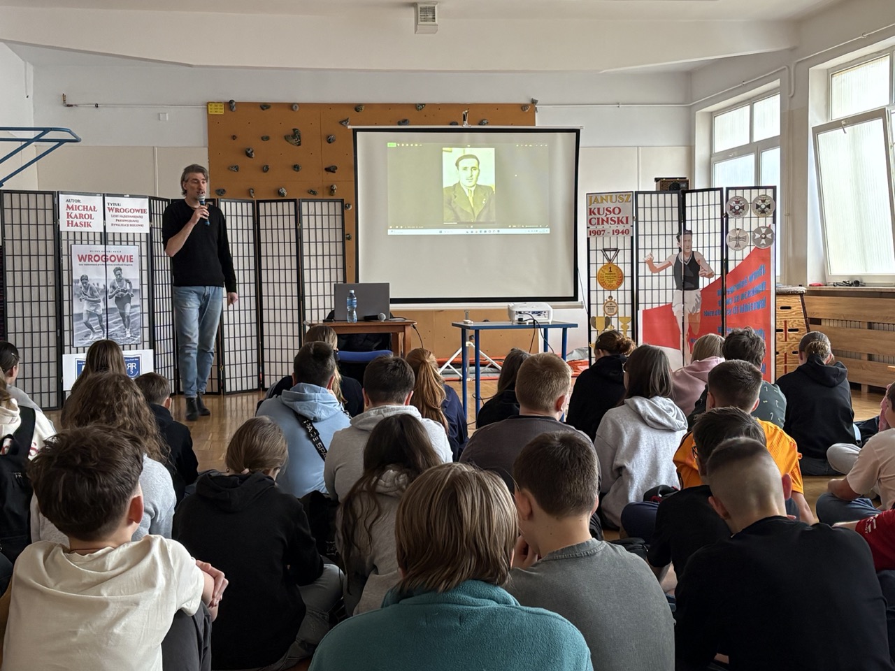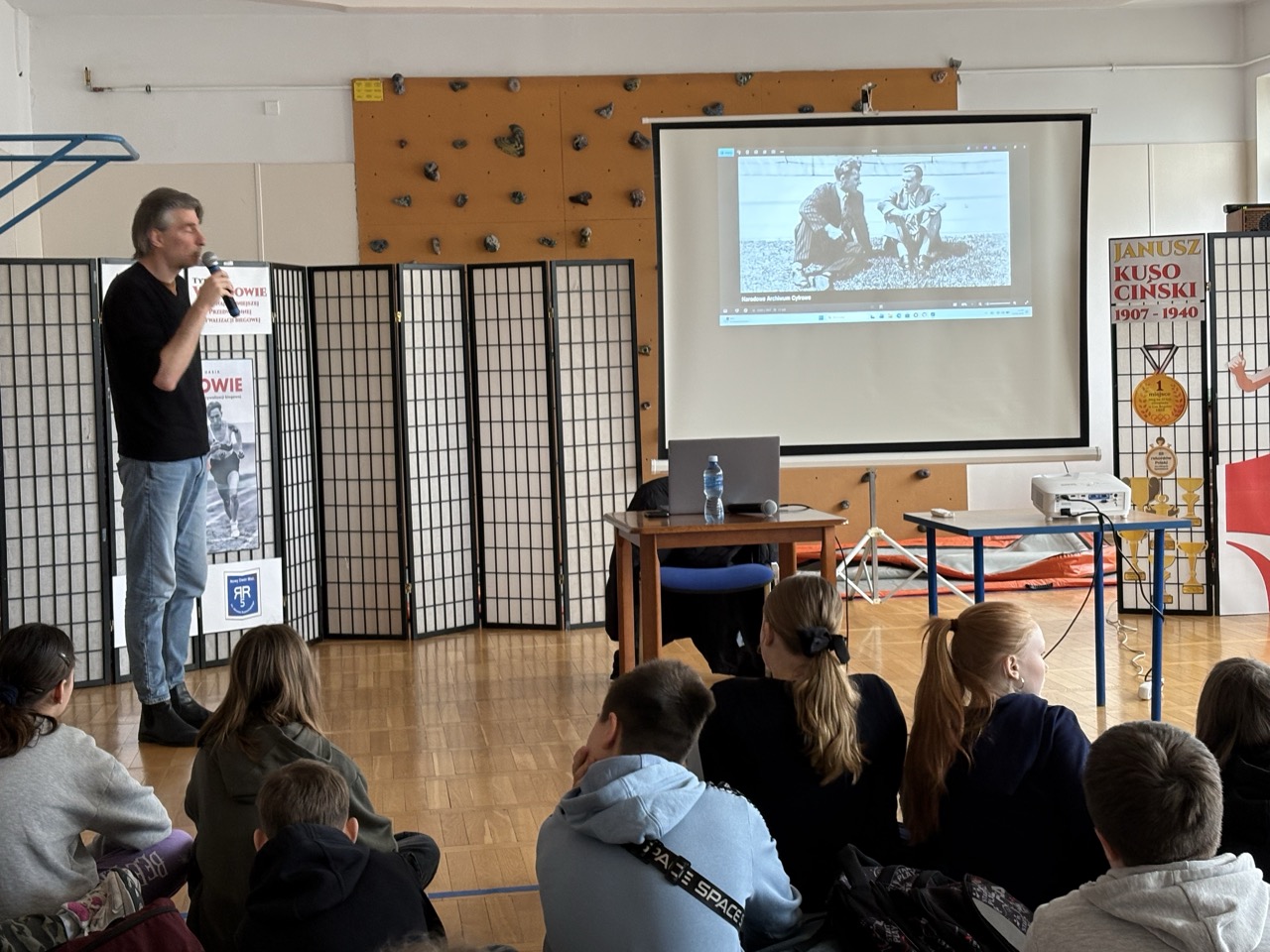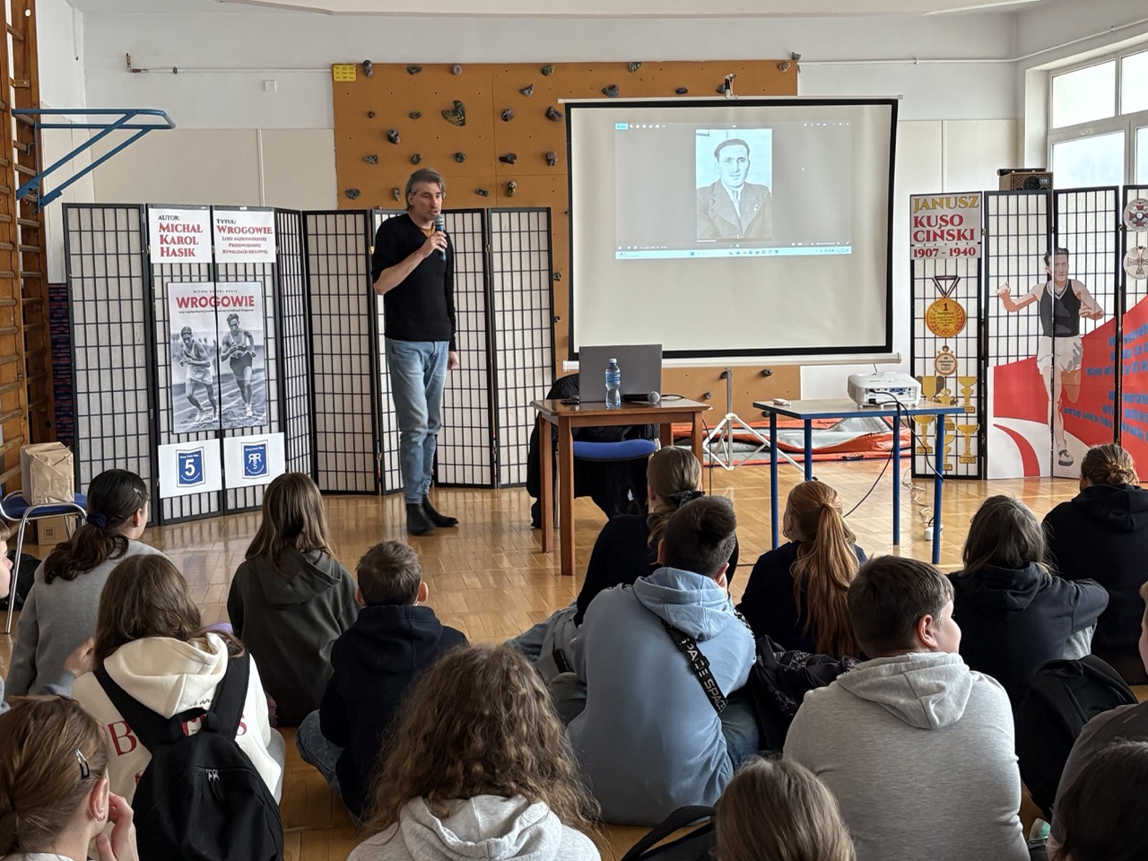 We wtorek 24 lutego gościem naszej szkoły był pan Michał Karol Hasik, który poprowadził spotkanie z uczniami klas 6, poświęcone naszemu patronowi Januszowi Kusocińskiemu. Organizatorem spotkania była szkolna biblioteka, wsparcia finansowego udzieliła Rada Rodziców.